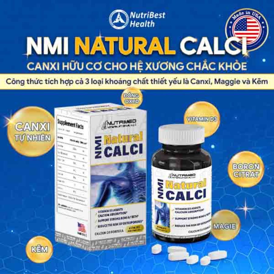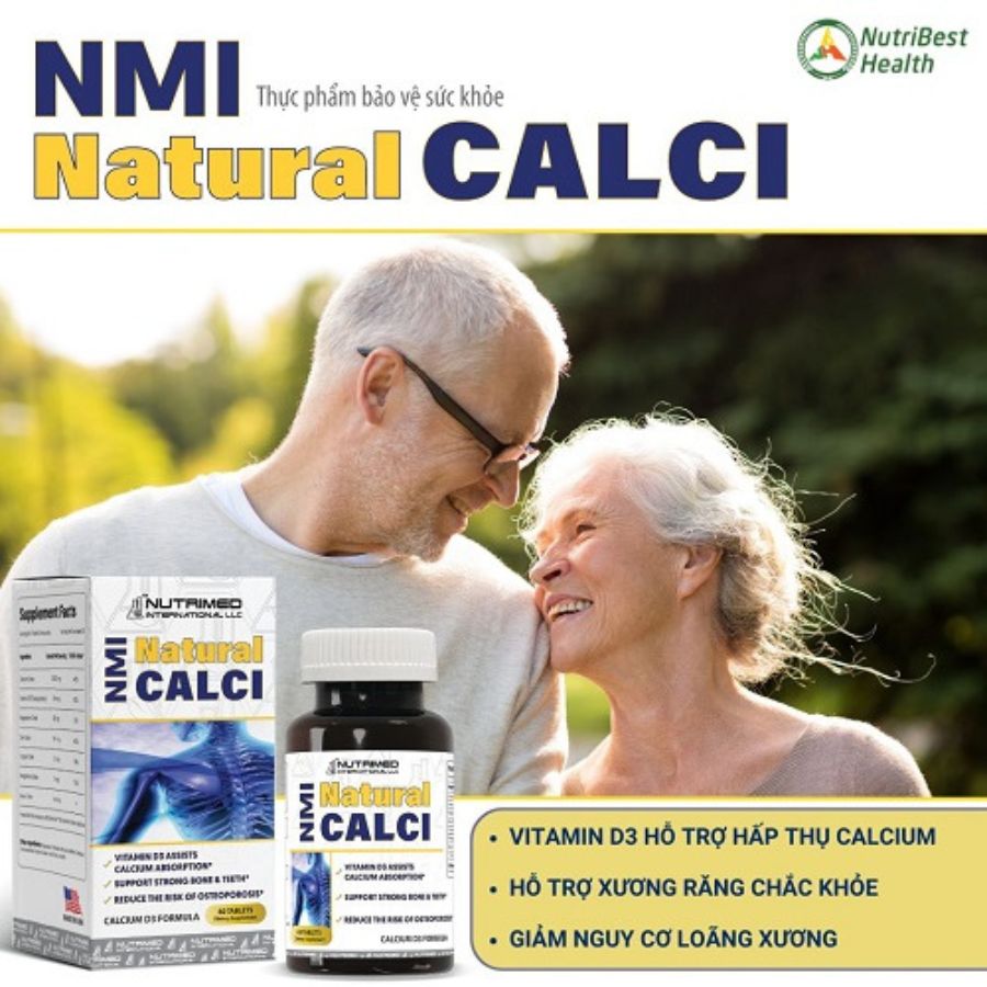 NMI Natural Calci là thực phẩm bảo vệ sức khỏe được sản xuất bởi NutriBest Health, Hoa Kỳ. Sản phẩm cung cấp canxi tự nhiên, dễ hấp thu giúp cải thiện các tình trạng thiếu canxi như đau cơ, đau nhức xương khớp bả vai, loãng xương, hỗ trợ phục hồi với những trường hợp gãy xương do chấn thương.
