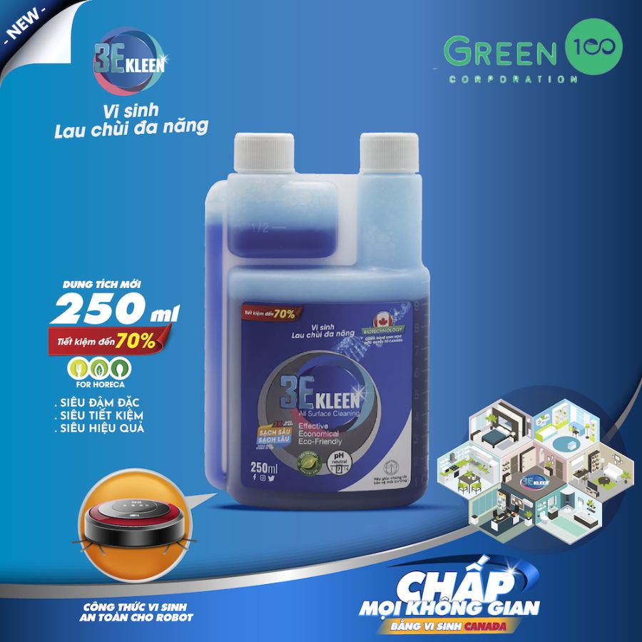 Bộ vi sinh lau chùi đa năng 3E KLEEN vi sinh lau đa năng – ứng dụng công nghệ sinh học CANADA – thành phần chứa công thức vi sinh giúp làm sạch sâu và lâu các bề mặt, ngăn mùi và vi khuẩn gây bệnh. Thành phần tự nhiên dễ phân hủy sinh học đạt tiêu chuẩn Châu Âu, an toàn sức khỏe và thân thiện môi trường. pH ~7 (trung tính) không gây kích ứng da, an toàn cho các bề mặt và thiết bị điện tử, không chứa hợp chất hữu cơ dễ bay hơi (VOCs) độc hại.