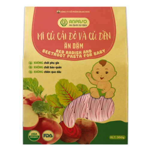 Mì củ cải đỏ và củ dền hữu cơ Anpaso tự hào là sản phẩm mì rau củ hữu cơ chuẩn 5K đầu tiên tại Việt Nam, được cấp chứng nhận hữu cơ USDA của Bộ Nông Nghiệp Hoa Kỳ và FDA Hoa Kì về An toàn thực phẩm.