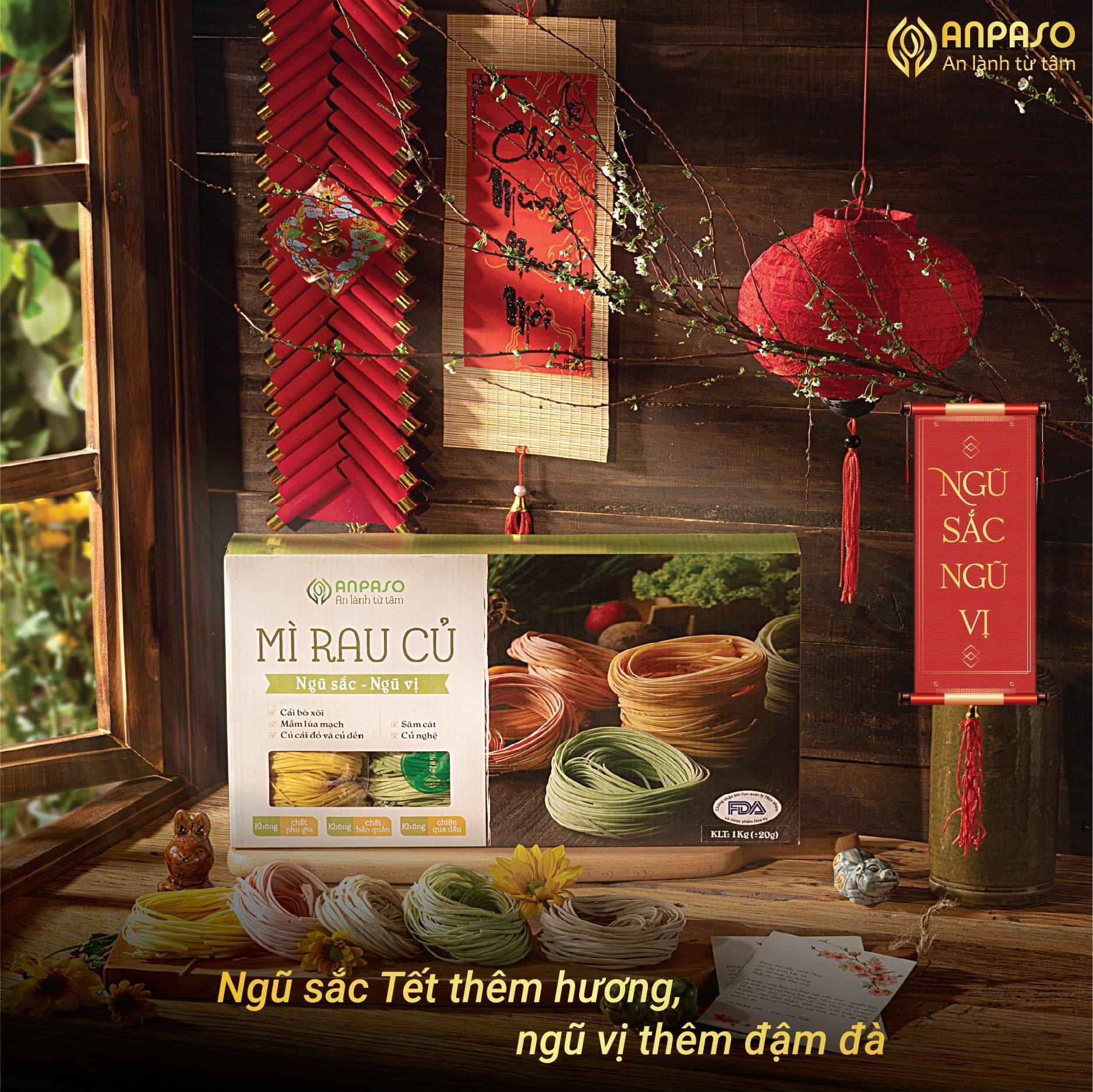 Quy cách: Gồm 5 vị mì rau củ ngũ sắc ngũ vị truyền thống của Anpaso: cải bó xôi, mầm lúa mạch, sâm cát, nghệ, củ cải đỏ và củ dền