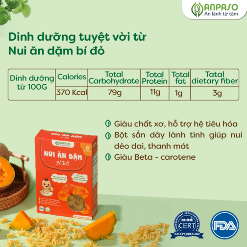Độ tuổi trên 6 tháng, hệ tiêu hóa và bộ phận xử lý thức ăn dần hoàn thiện và phát triển. Trong giai đoạn này các mẹ nên kết hợp bổ sung các sản phẩm ăn dặm để giúp bé tập nhai, kích thích răng miệng phát triển, tập làm quen các nguồn dinh dưỡng khác bên cạnh sữa mẹ. Nui ăn dặm Anpaso, ngoài việc bổ sung dinh dưỡng, tốt cho tiêu hóa của bé thì với kết cấu nui xoắn, màu sắc bắt mắt giúp bé dễ dàng cầm nắm, hào hứng với các bữa ăn. Nui mềm dai, ngon ngọt tự nhiên góp phần tạo khẩu vị cho bé ăn thêm ngon, tập nhai và học ăn tăng thô.