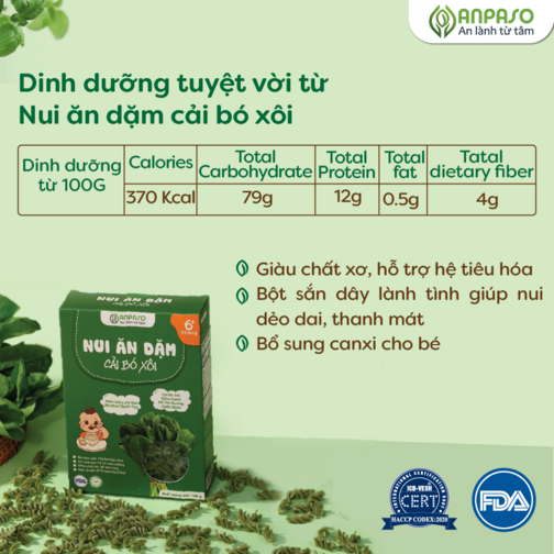 Độ tuổi trên 6 tháng, hệ tiêu hóa và bộ phận xử lý thức ăn dần hoàn thiện và phát triển. Trong giai đoạn này các mẹ nên kết hợp bổ sung các sản phẩm ăn dặm để giúp bé tập nhai, kích thích răng miệng phát triển, tập làm quen các nguồn dinh dưỡng khác bên cạnh sữa mẹ. Nui ăn dặm Anpaso, ngoài việc bổ sung dinh dưỡng, tốt cho tiêu hóa của bé thì với kết cấu nui xoắn, màu sắc bắt mắt giúp bé dễ dàng cầm nắm, hào hứng với các bữa ăn. Nui mềm dai, ngon ngọt tự nhiên góp phần tạo khẩu vị cho bé ăn thêm ngon, tập nhai và học ăn tăng thô.